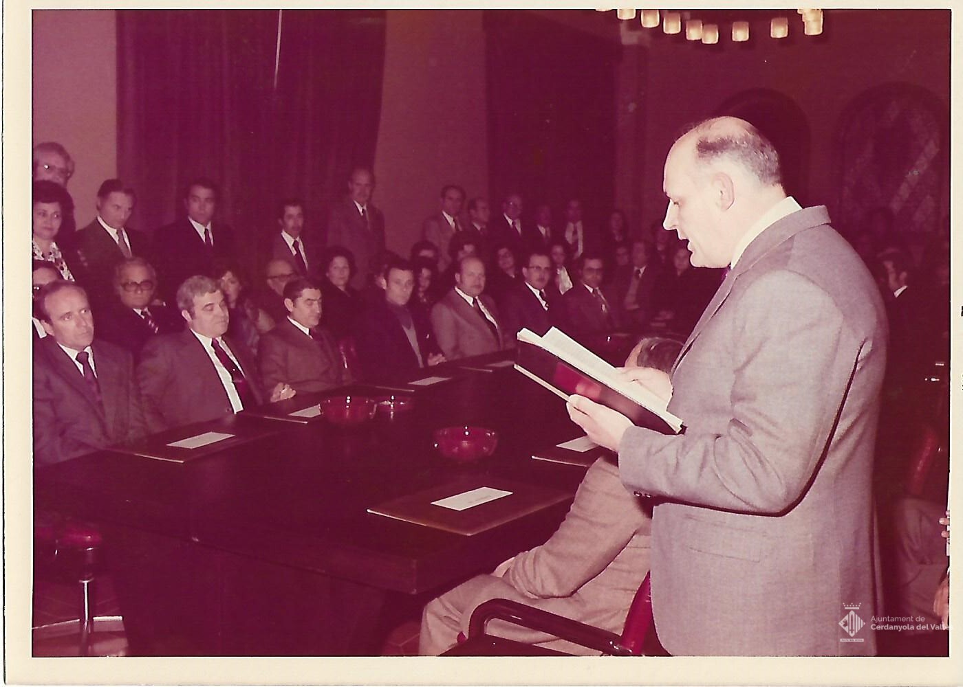 Acte d'homenatge a la sala del Ple de l'Ajuntament de Cerdanyola del Vallès presidit per l'alcalde Domingo Fatjó Sanmiquel per la jubilació del secretari Justiniano Hidalgo Barriuso el 26 de març de 1975