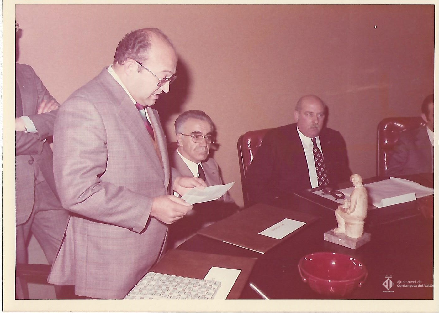 Acte d'homenatge a la sala del Ple de l'Ajuntament de Cerdanyola del Vallès presidit per l'alcalde Domingo Fatjó Sanmiquel per la jubilació del secretari Justiniano Hidalgo Barriuso el 26 de març de 1975
