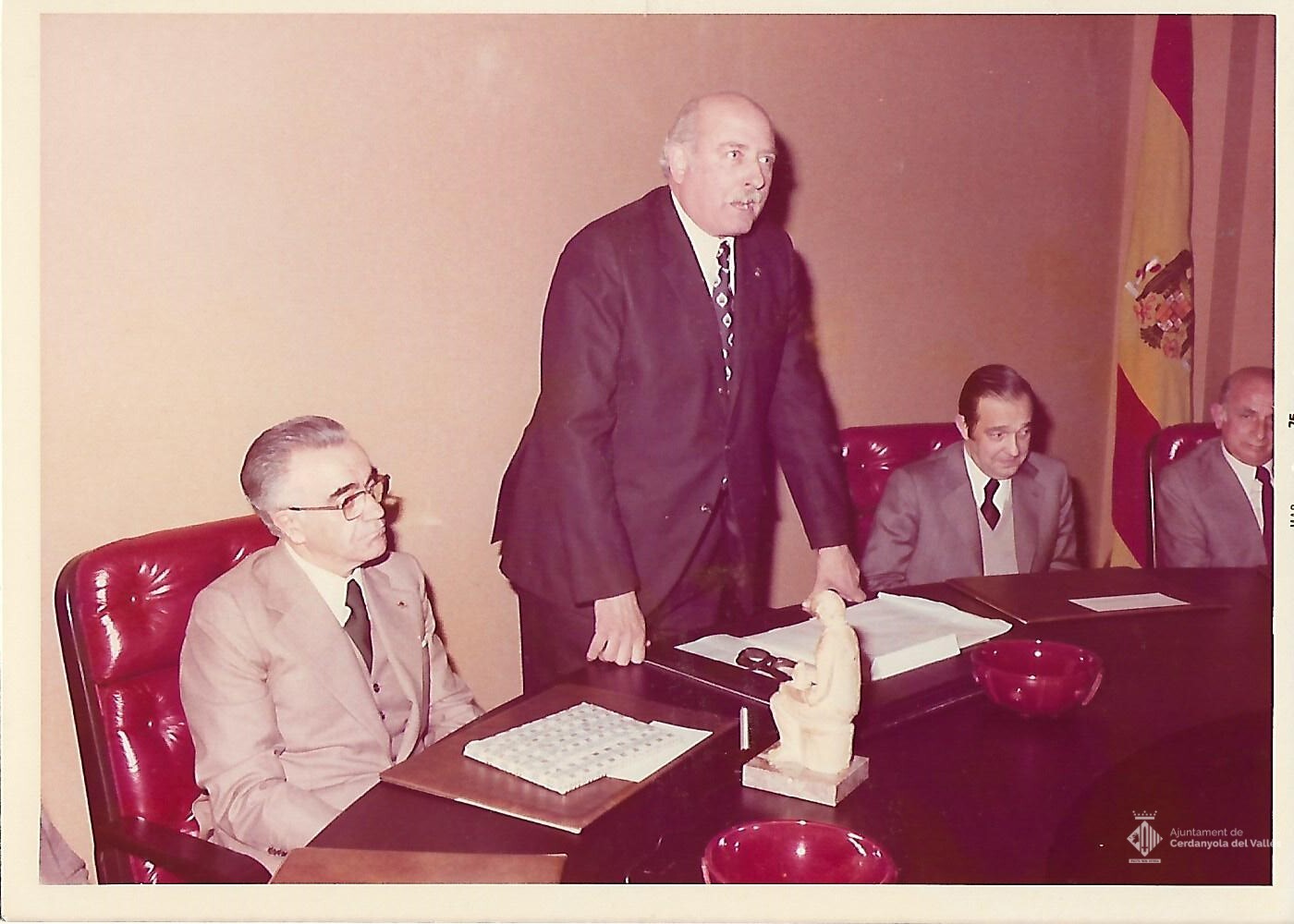Acte d'homenatge a la sala del Ple de l'Ajuntament de Cerdanyola del Vallès presidit per l'alcalde Domingo Fatjó Sanmiquel per la jubilació del secretari Justiniano Hidalgo Barriuso el 26 de març de 1975