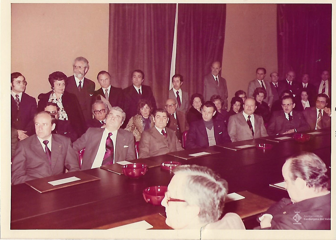 Acte d'homenatge a la sala del Ple de l'Ajuntament de Cerdanyola del Vallès presidit per l'alcalde Domingo Fatjó Sanmiquel per la jubilació del secretari Justiniano Hidalgo Barriuso el 26 de març de 1975