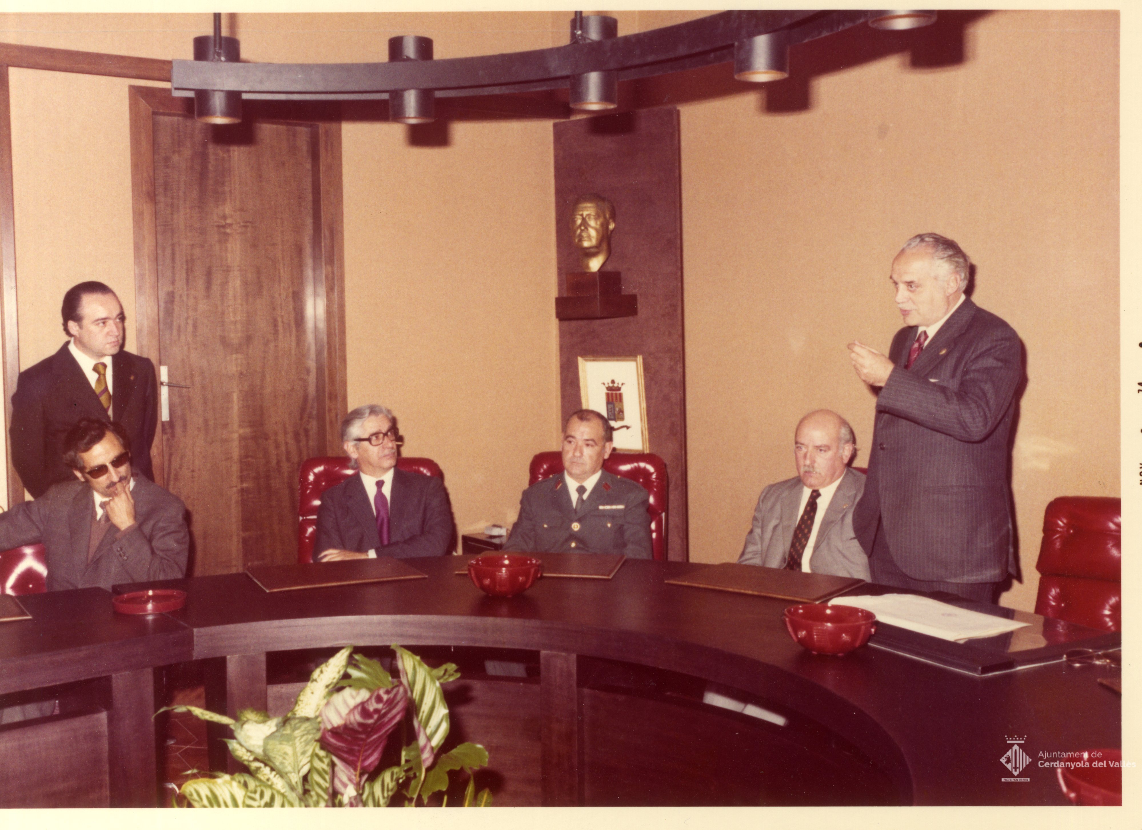 Acte d'homenatge no identificat celebrat a la sala del Ple de l'Ajuntament de Cerdanyola del Vallès presidit per l'alcalde Domingo Fatjó Sanmiquel durant algun moment del seu mandat (1959-1976)