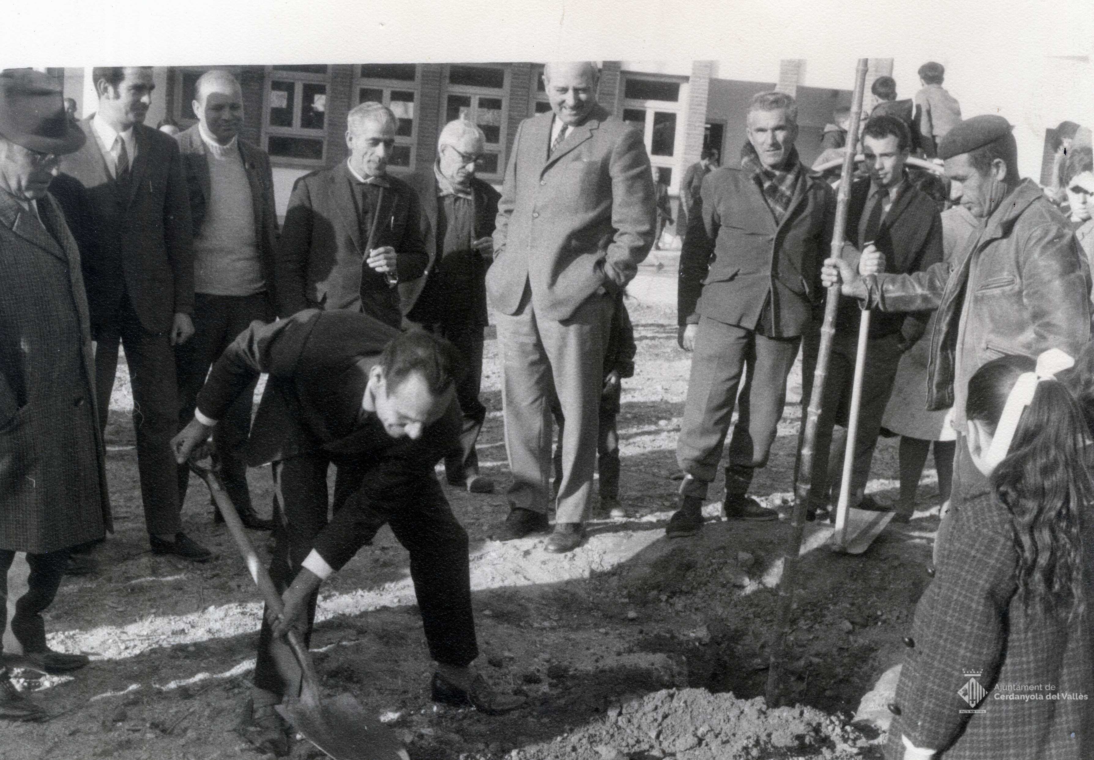 Plantada d'arbres a l'Escola Sant Martí de Cerdanyola del Vallès presidida per l'alcalde Domingo Fatjó Sanmiquel el 30 de març de 1968