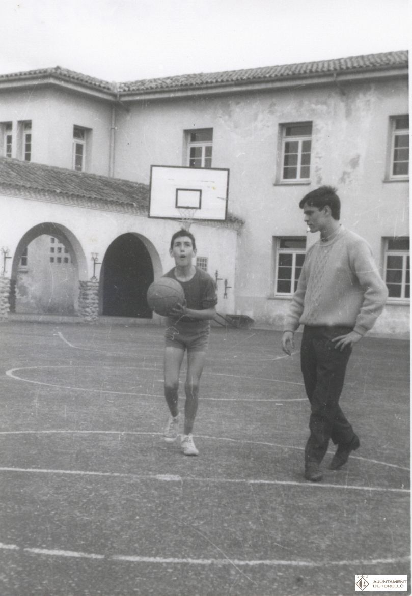 Nen jugant a bàsquet al pati de l'escola Dr Fortià Solà