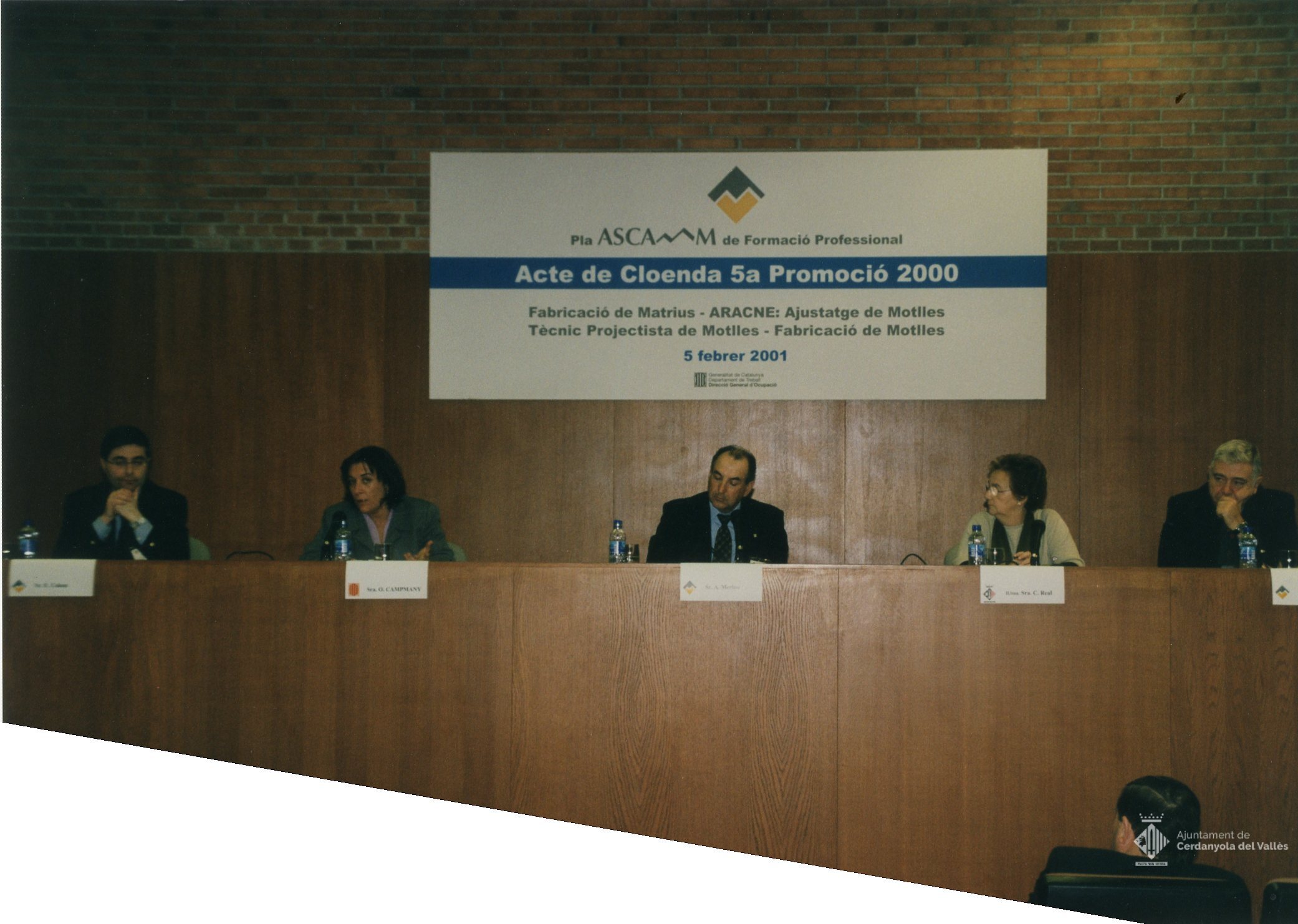 Cloenda de la cinquena promoció 2000 amb la presencia de l'alcaldessa Cristina Real i Masdeu i el President de la fundació ASCAMM. Antoni Peñarroya Trench.