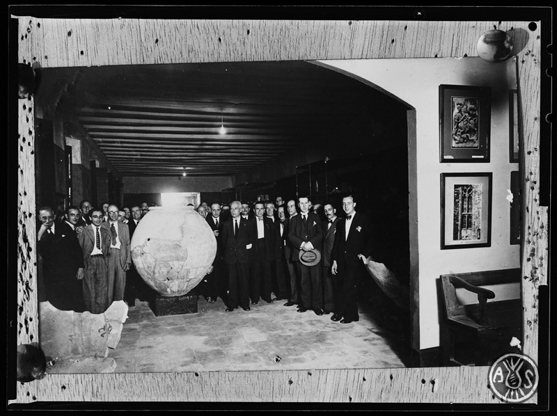 Inauguració del Museu d'Història de Sabadell a l'antiga casa Casanovas, carrer de Sant Antoni, 13. Personatges locals al voltant d'un dolium de La Salut: Salvador Ribé (alcalde de Sabadell), Joan Mora (diputat) i altres elements afins. Primer dia de Festa