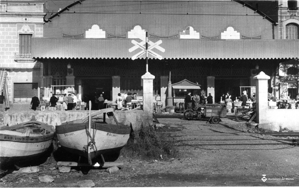 Mercat municipal i pas a nivell des de la platja. A la platja hi ha algunes barques varades.
