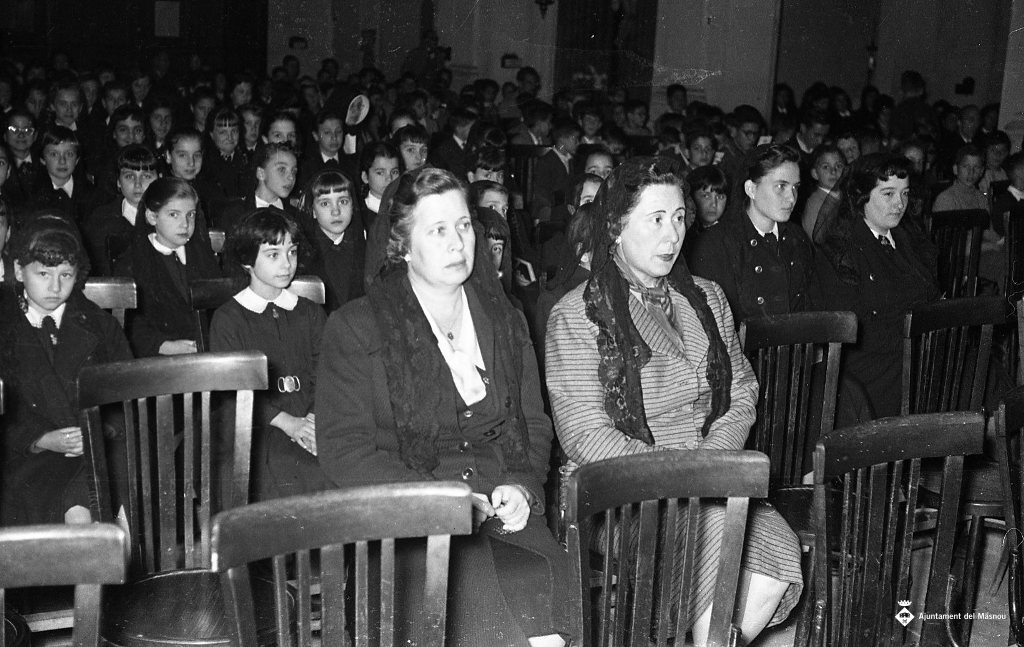 Missa amb les nenes de les Escolàpies. Al davant Rosa Tauler Oliver i Araceli Campo Prieto de la Sección Femenina. Igual a la 677.