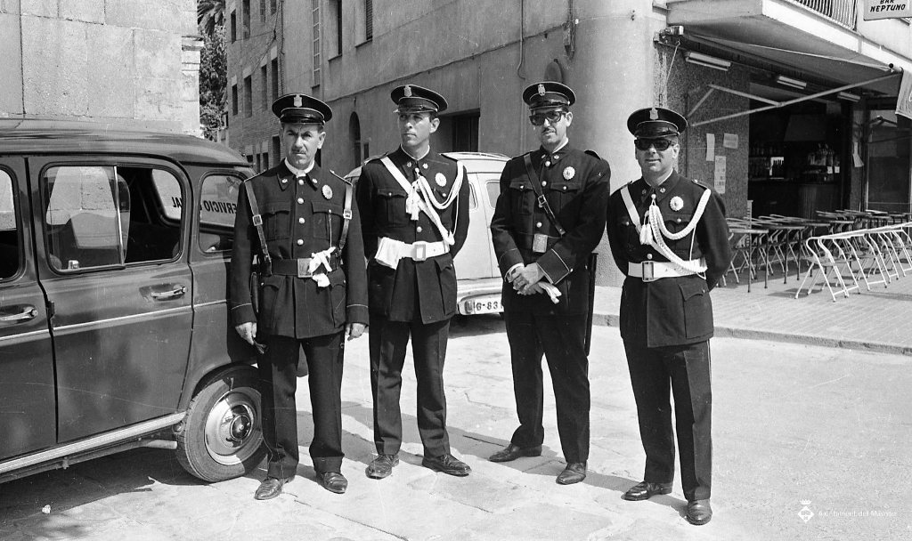 D'esquerra a dreta: Magí Reull Enrich, Rafael Laguillo Estrada, Ángel Trena Guillén i Josep Miravet Grífol. Hi ha el Bar Neptuno al darrere.